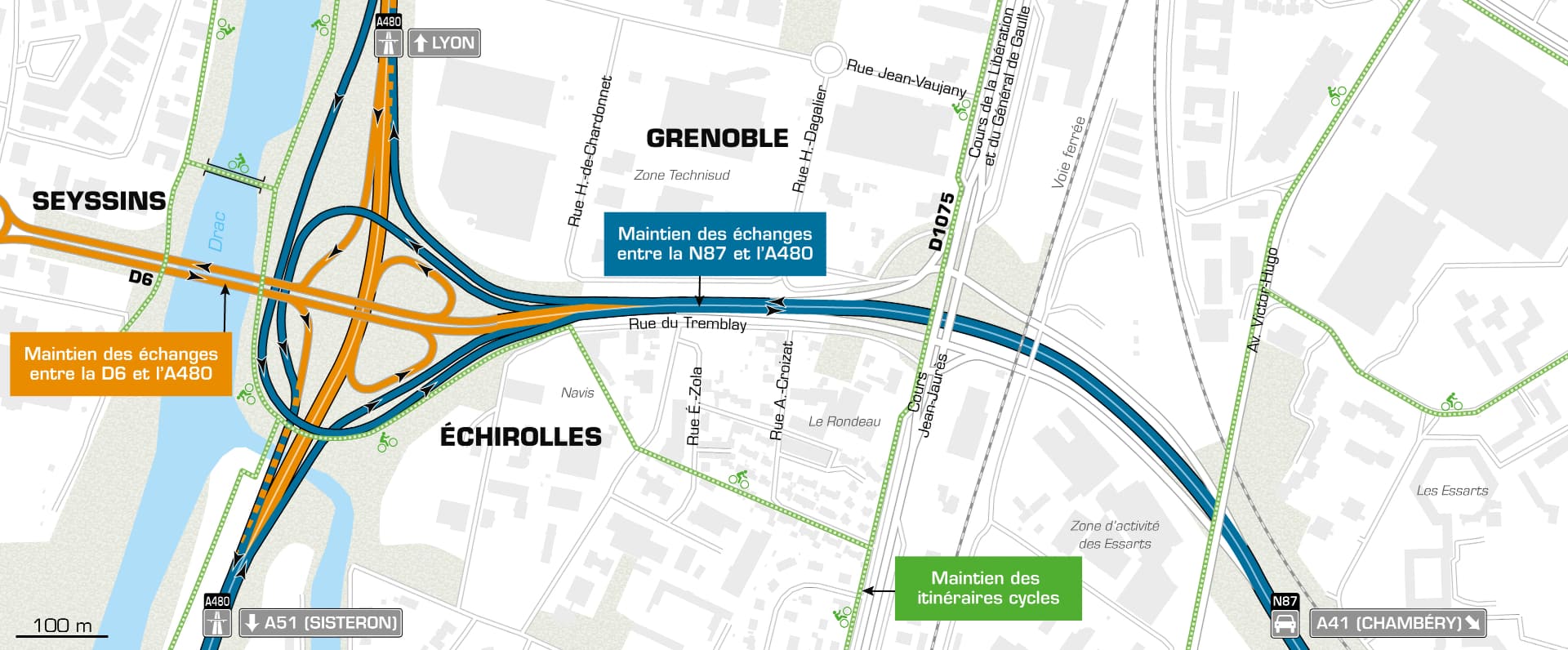 Des fermetures nocturnes ponctuelles de la N87 seront nécessaires afin d’installer le balisage indispensable sur la zone de travaux. La bretelle de sortie depuis Chambéry vers le Cours de la Libération sera réduite à une voie et fermée une partie de l’été 2020. Des itinéraires de déviation sont mis en place au cours de ces fermetures.