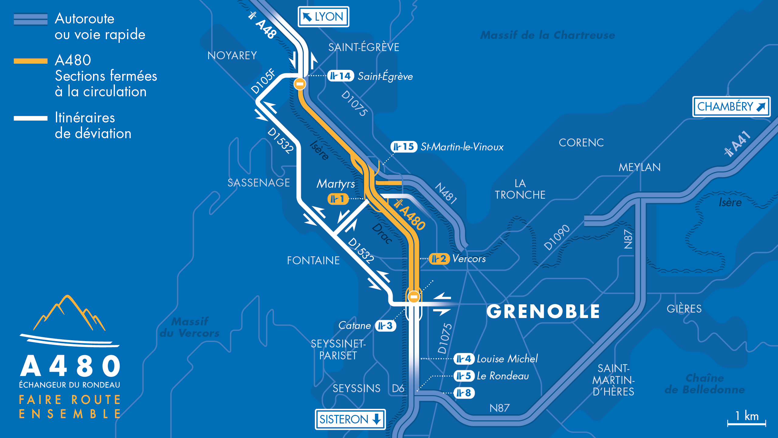 L’autoroute A48 ainsi que l’autoroute A480 seront fermées les nuits du mercredi 21 et jeudi 22 octobre 2020 dans le cadre des travaux d’aménagement de ces axes autoroutiers. Ainsi pour les automobilistes circulant :