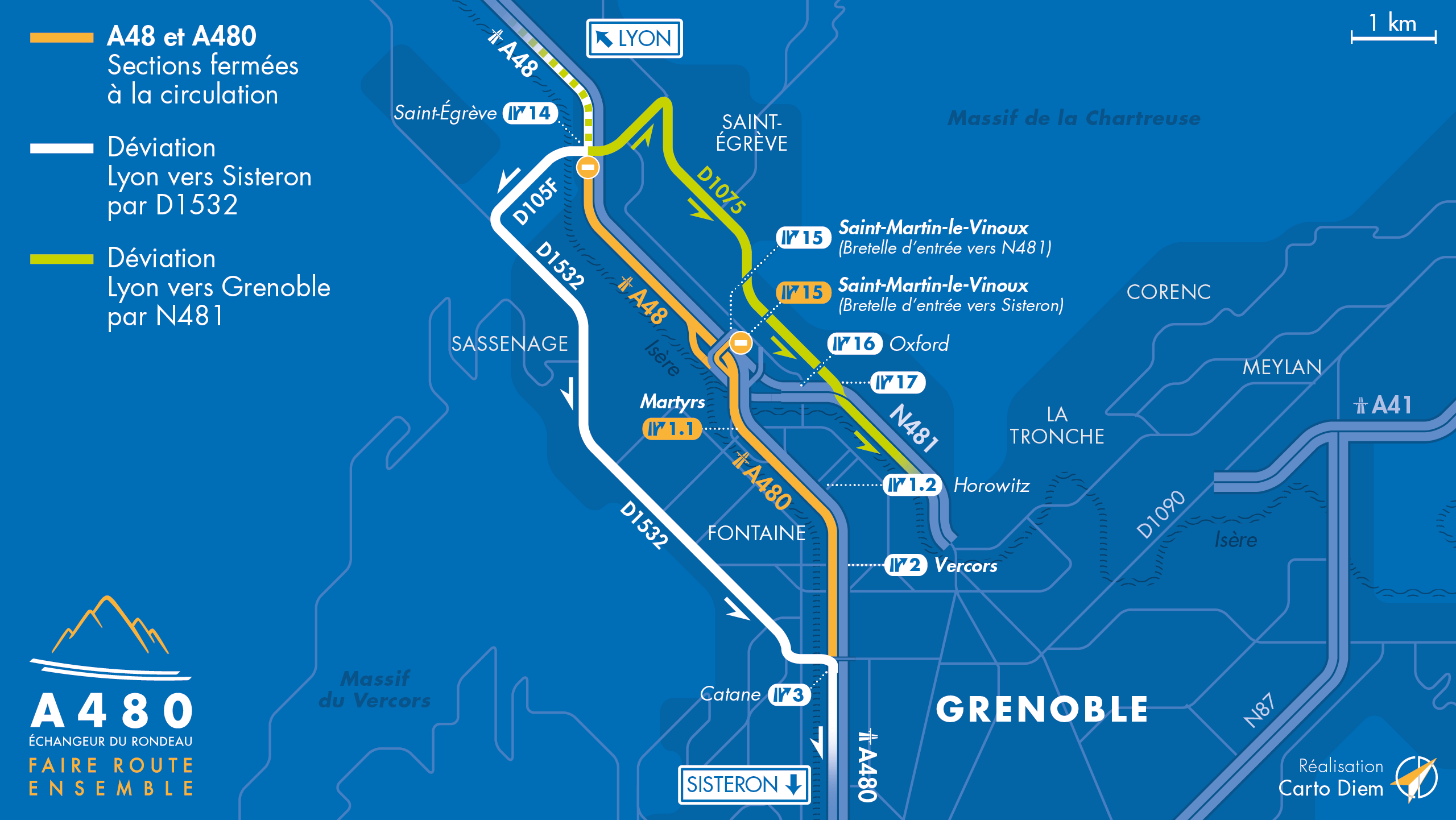 Dans le cadre de la campagne d’entretien annuel de l’autoroute intégrée A480, une partie du réseau autoroutier sera fermée à la circulation la nuit du lundi 23 octobre 2023.