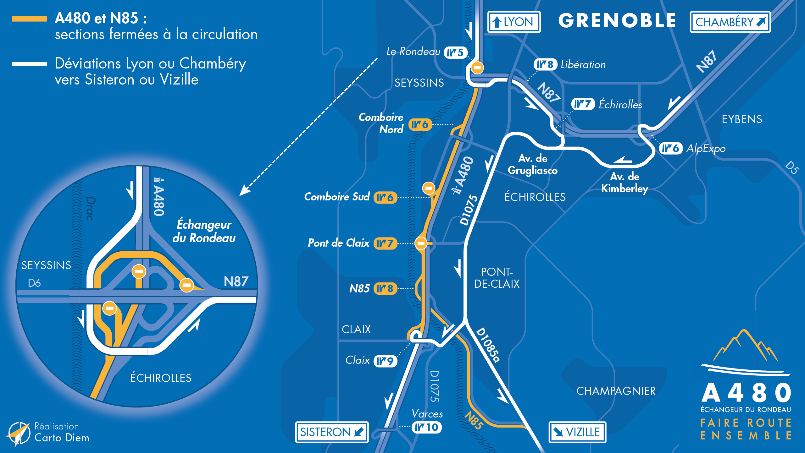 En direction de Sisteron, l’autoroute A480 sera fermée depuis l’échangeur du Rondeau (n°5.2) jusqu’au diffuseur de Claix (n°9) de 21h à 6h.