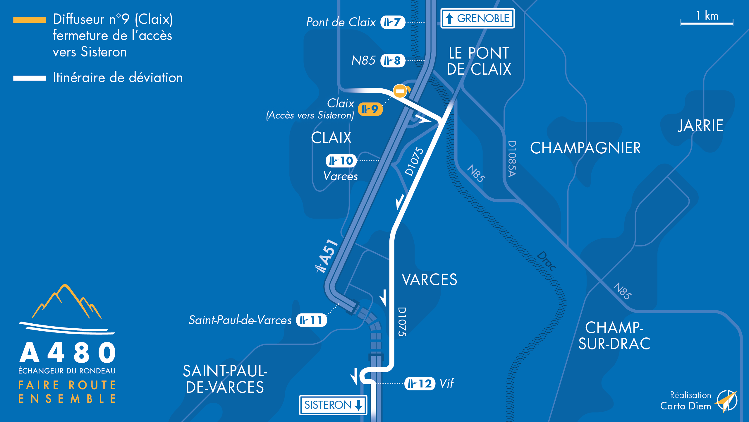 Dans le cadre des travaux d’aménagement de l’A480, la bretelle d’entrée en direction de Sisteron du diffuseur de Claix (n°9) est fermée 24h/24 à la circulation du lundi 23 au vendredi 27 août 2021.