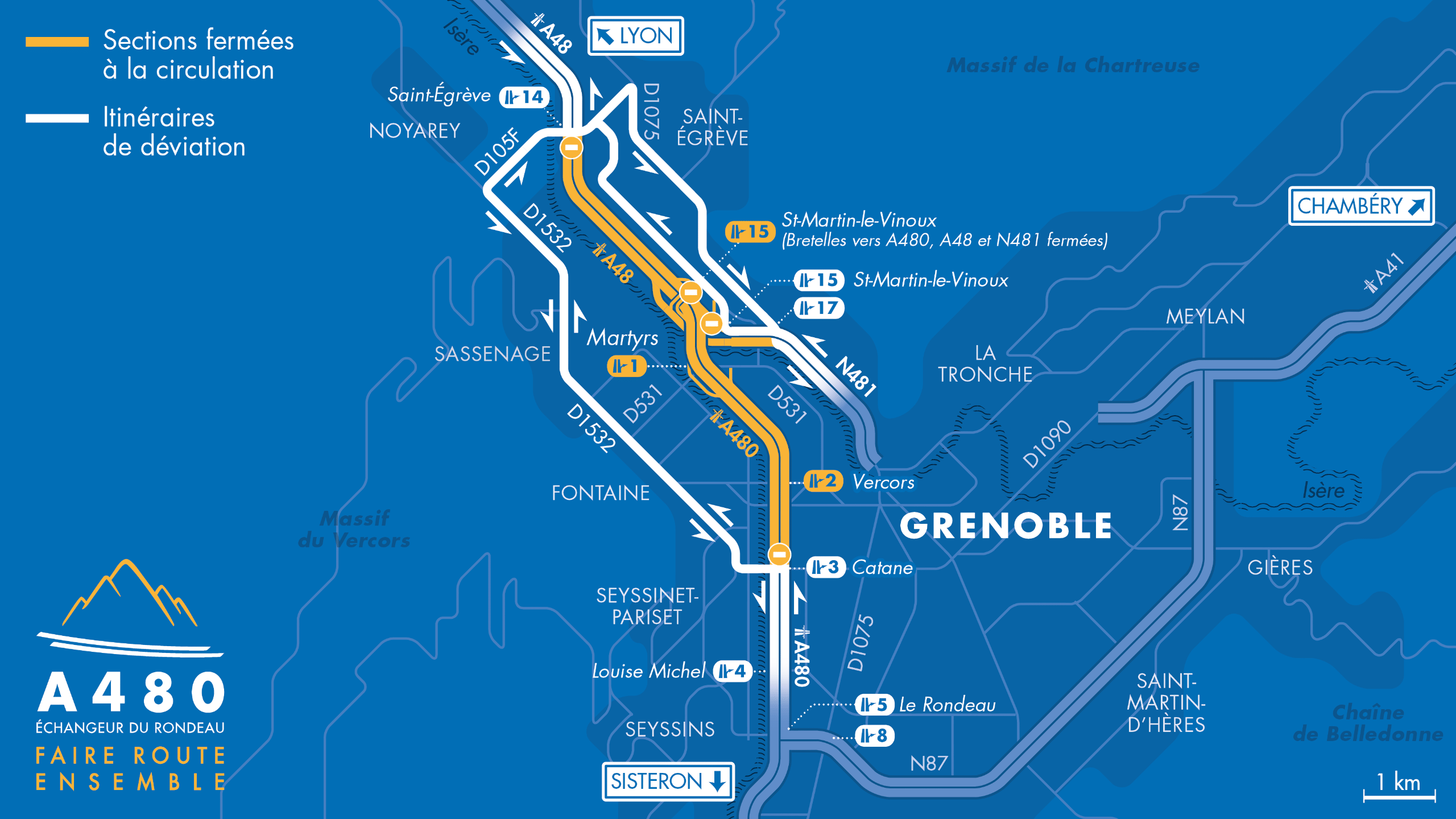 - En direction de Grenoble, au niveau du giratoire du diffuseur de Saint-Martin-le-Vinoux (n°15), la bretelle d’entrée sur la N481 sera fermée à partir de 21h.