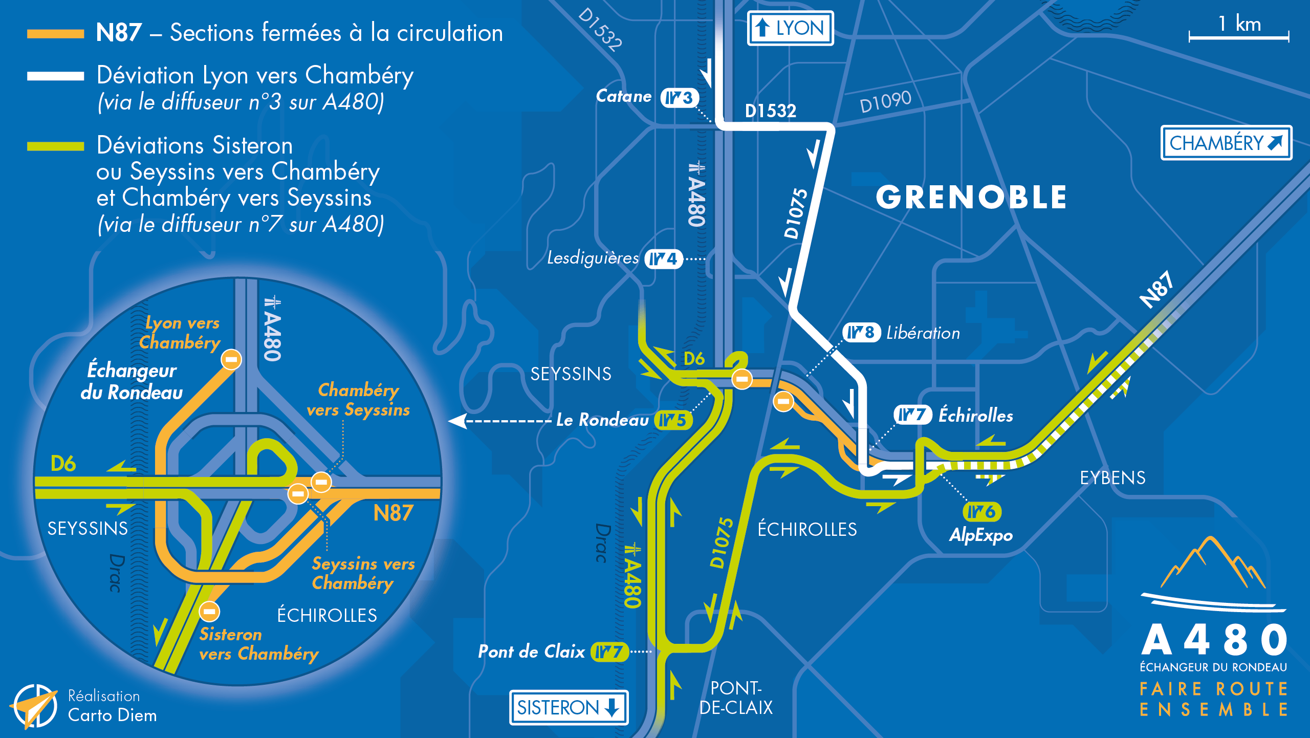 - La section de la jonction entre la départementale D6 et la nationale N87 après la boucle d’insertion vers l’autoroute A480 Nord.